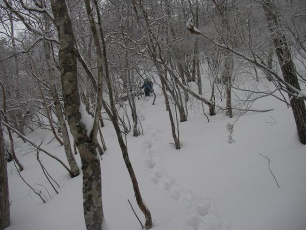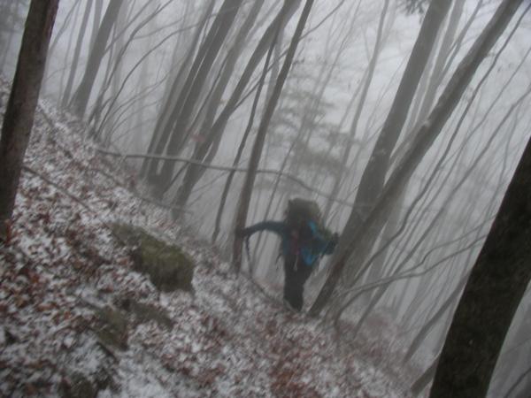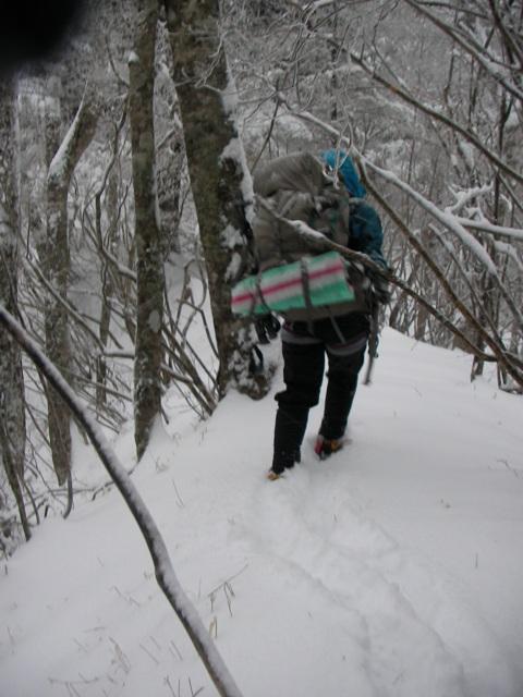 雪が雨に変わり始めたので、踏み跡とテープ印を忠実に辿りましたが、