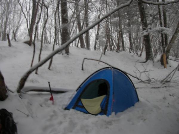 テント外に火器を置き、雪が降っていたのでテント内から操作・調理しました。
