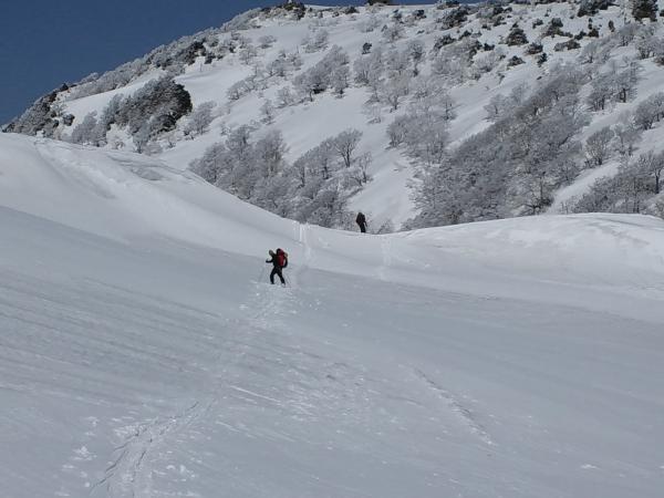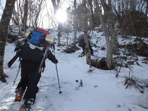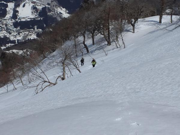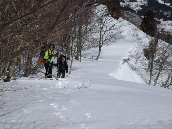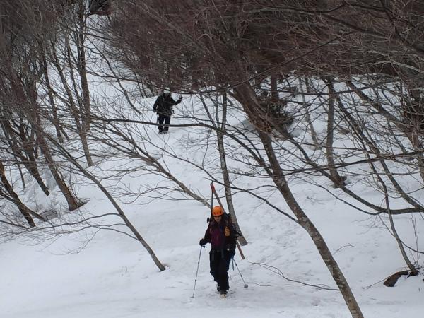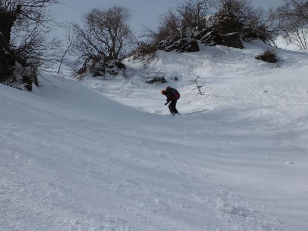 ねじれ谷に滑り込みますが、カリカリに凍っており、箕輪さんが滑落、大事をとってコース変更