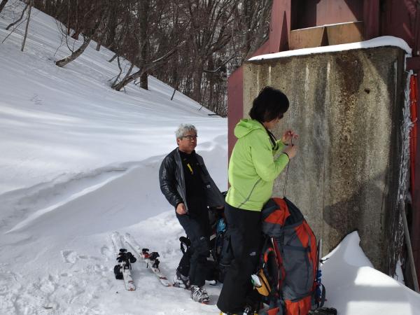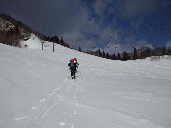 ゲレンデは既に閉鎖しており、貸し切りでした、傾斜のきつい所で、滑落停止訓練など雪上訓練を