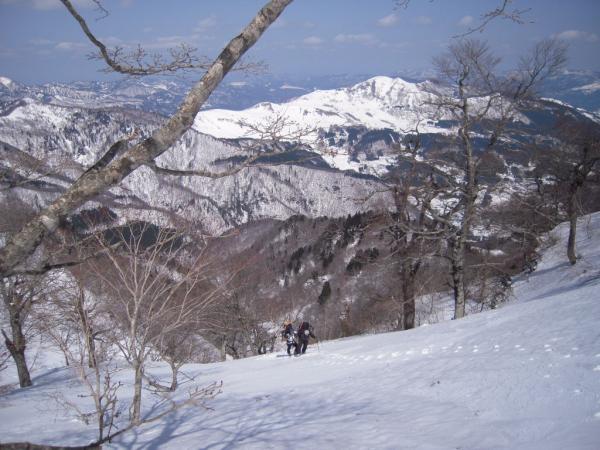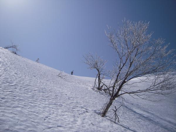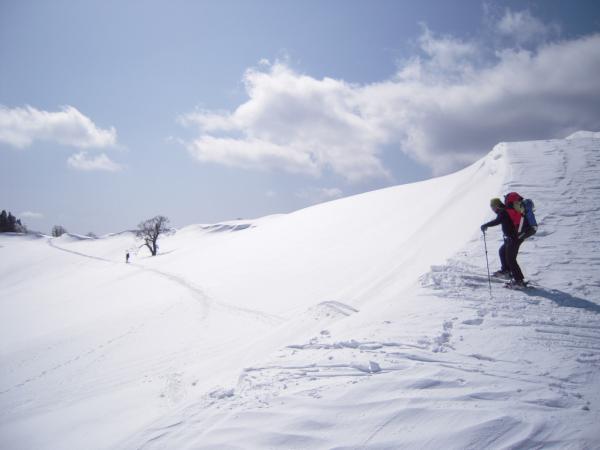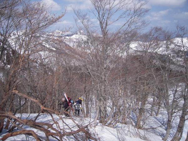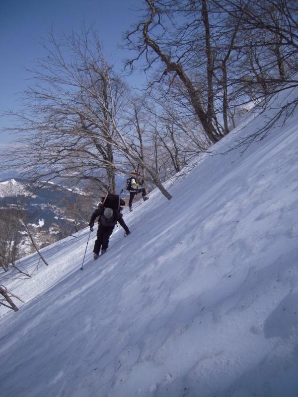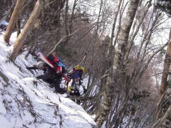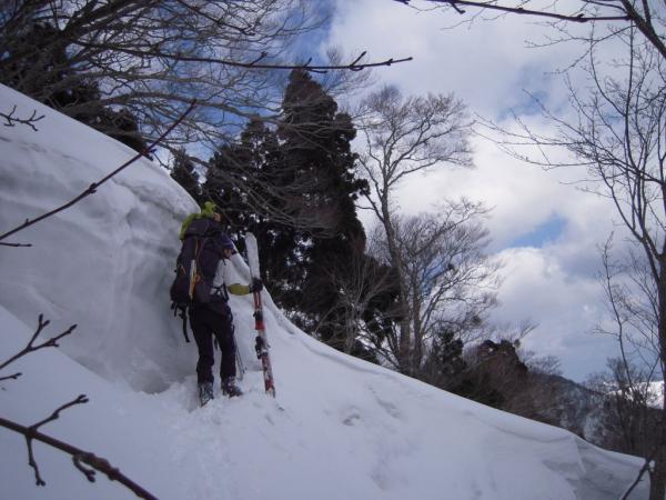 流れ尾は足場の悪い所もあり、バランスを取ったり、スキー板を枝にひっかけたりしないように気を配りながら登ります。