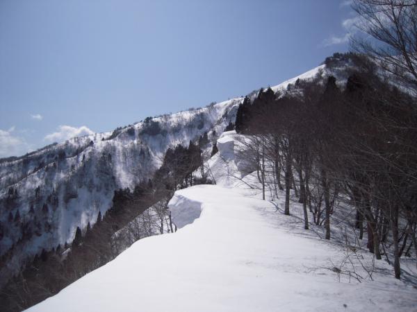 流れ尾合流地点は雪庇を越えないといけないので注意が必要です。