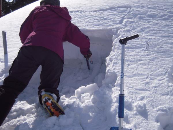 翌朝は雪洞をつぶす前に、雪洞を利用してプローブの人に当たった感触の確認。