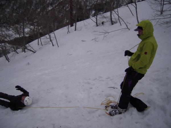 最後に営業の終了したスキー場の斜面を利用して滑落停止やビレイの練習をしました。