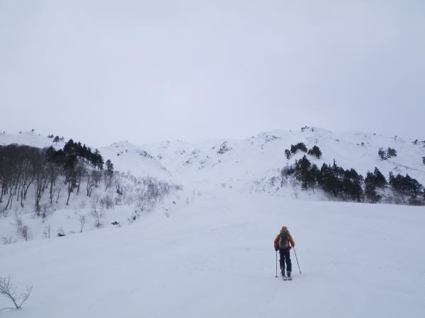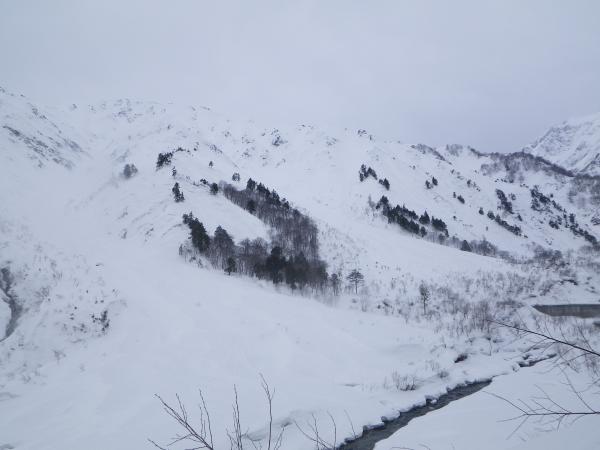 川の対岸に広がる沢筋に遊び場を求めて、登頂を断念。少しでも滑る気分を味わおうという判断でした。