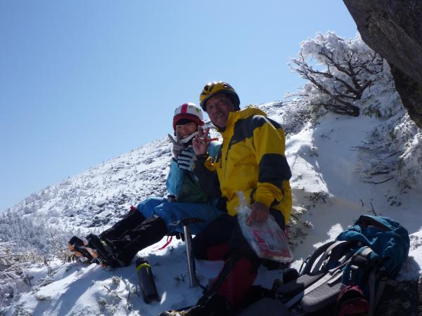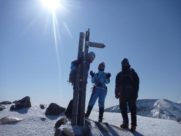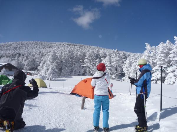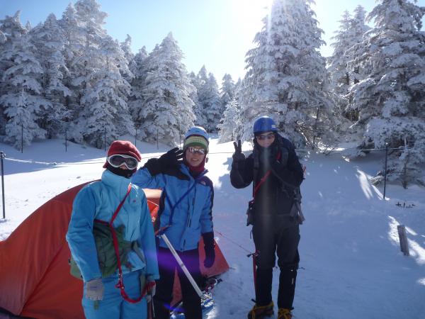 黒百合ヒュッテ前のテント場では、高校山岳部の合同合宿が行われており、入門雪山ベーシックコースとしての人気が窺える。