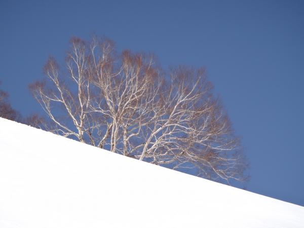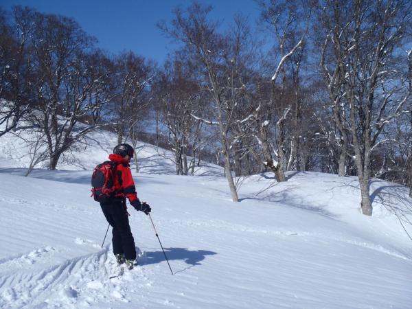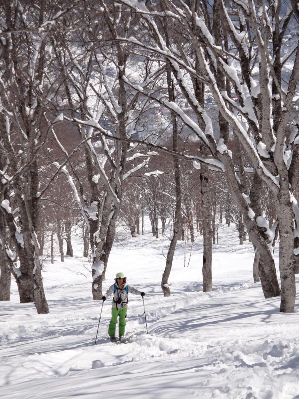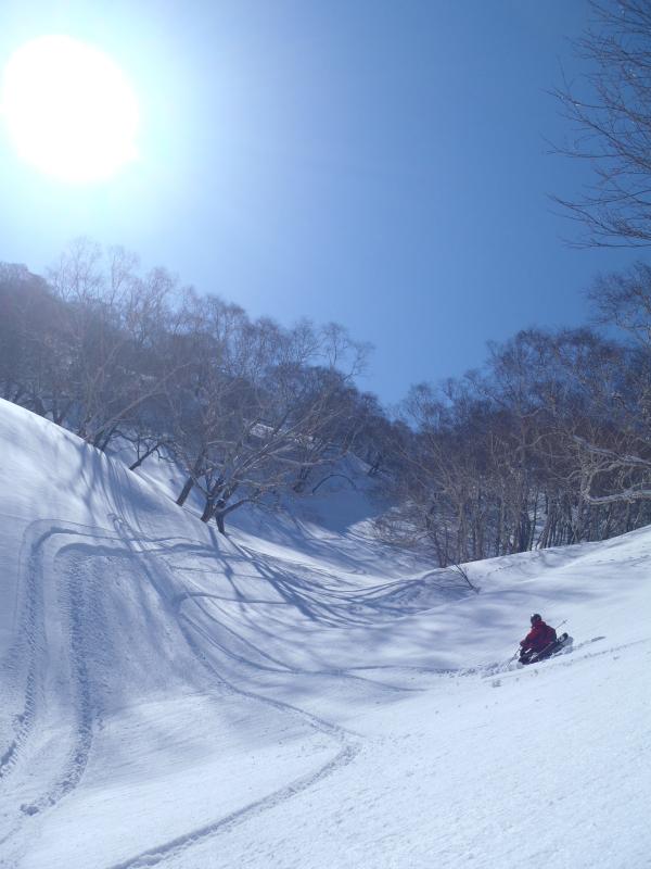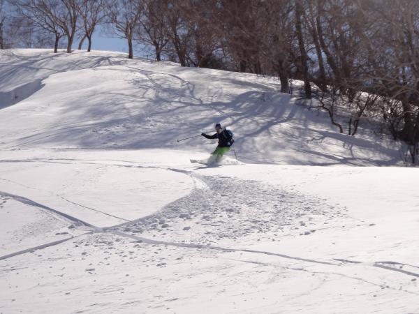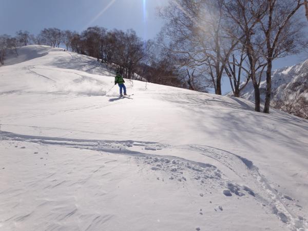 コースは小さな谷に吸い込まれ、日陰はパウダー、日当は硬い雪面と、天使と悪魔が揃ってご滞在。