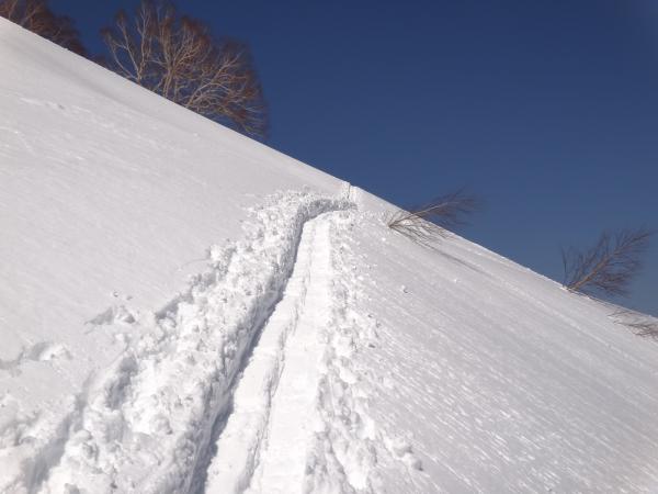 クラストした雪面はウエハースのようにもろく硬く・・スキーの厚み分だけ砕ける。
