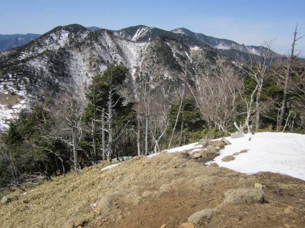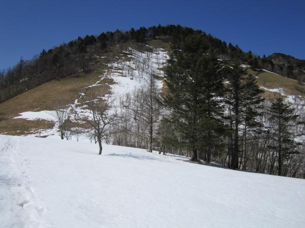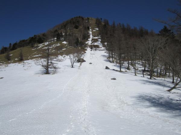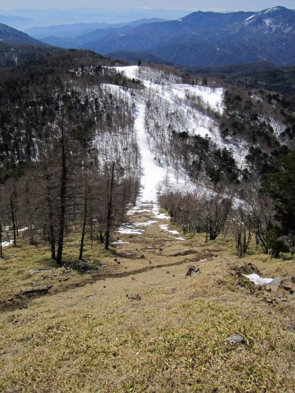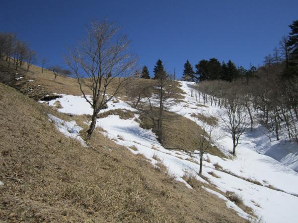 - 笠取山頂上直下と雁峠南面直下のみ夏道が現れていますが、全般的にまだ雪に覆われていました。