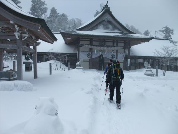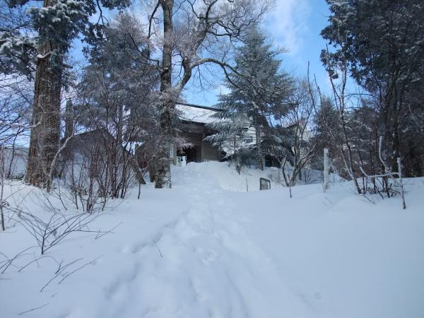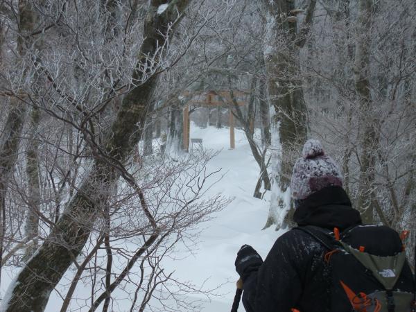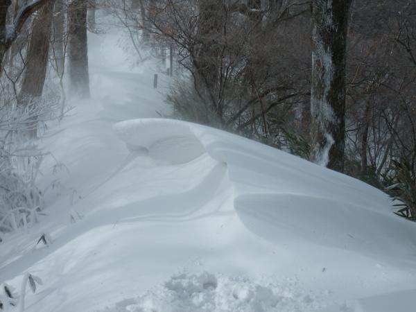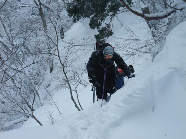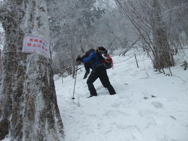 - 雪はふかふかで、初めはスノーシューが必要。途中から坂が急になるのでアイゼン(10本以上)が必要です。トレースはありません。ラッセルも必要です。第一の鎖場では迂回ルートも雪がかなり深く、危険だったためそこで引き返しました。