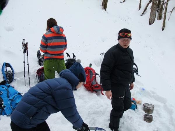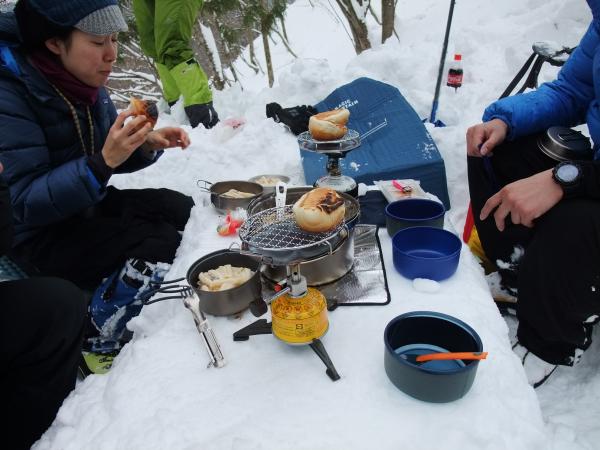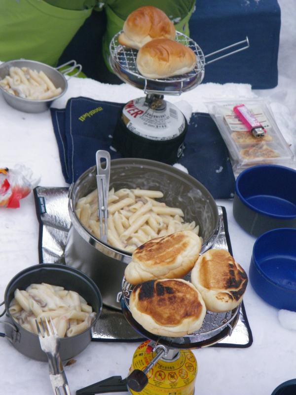今回は、楽しくスノーシューが目的だったため、適当なところで、テーブル作成!そりでひとしきり遊んだ後に、リーダーのおいしいランチをいただきました♪
