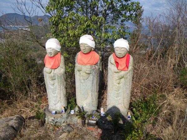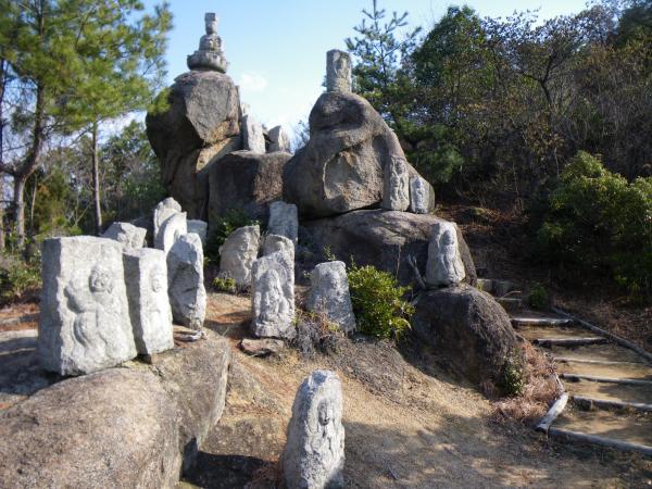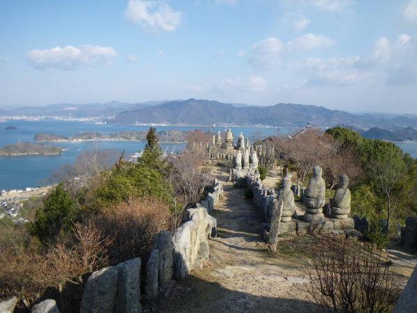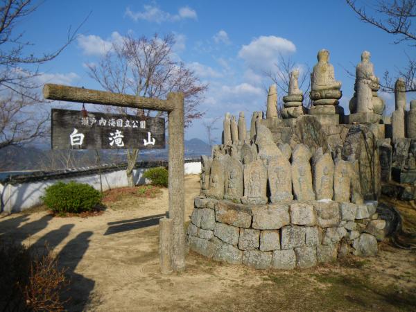 白滝山はもともと修行の山で、1569年、村上水軍当主が瀬戸内海の見張りとして観音堂を建立したらしい。仁王門から山頂までは石仏・磨崖仏などがいろいろあり、さらに山頂には700体ほど石仏が並んでいます。頂上から見る石仏と海の光景は有名な景色でにほんの里100選に選ばれています。