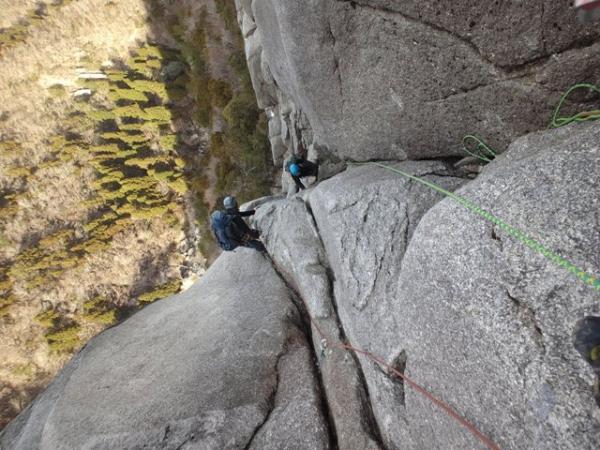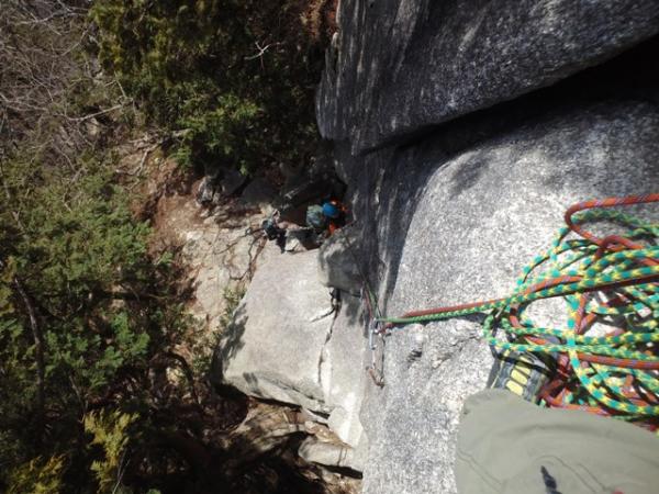 すこしトラバースして、ビレイ点から取付くと1Pで登れる。