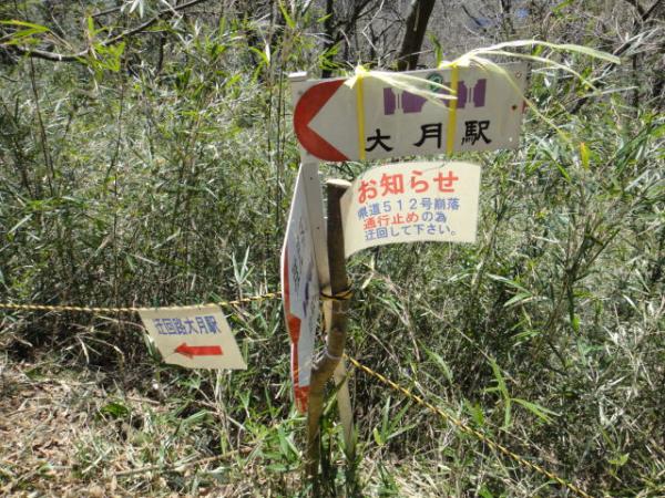 - JR大月駅→(0:15)→岩殿城跡入口→(0:25)→岩殿山山頂→(0:50)→稚児落し→(0:27)→浅利集落→(0:30)→JR大月駅