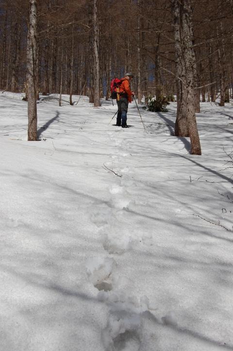 今回、雪はそんなに残ってないだろうと思っていましたが、野熊ノ池避難小屋あたりからしっかりとした雪道でした。(トレース無し)