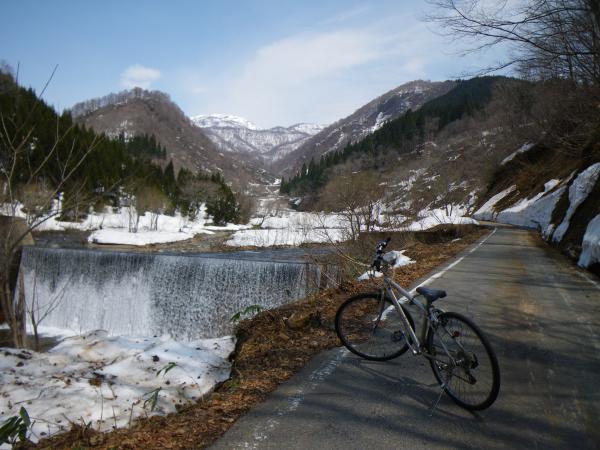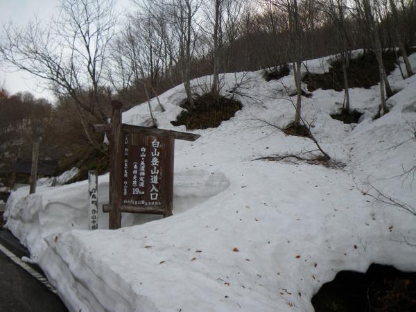 ①白山中居神社から先は毎年5月初旬頃開通。除雪されていたが、ゲートとその先ではブルドーザーで道が遮断されている。歩くと7kmの2時間30分くらいなので、自転車が便利。