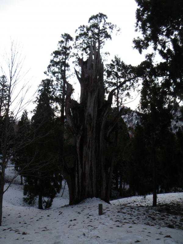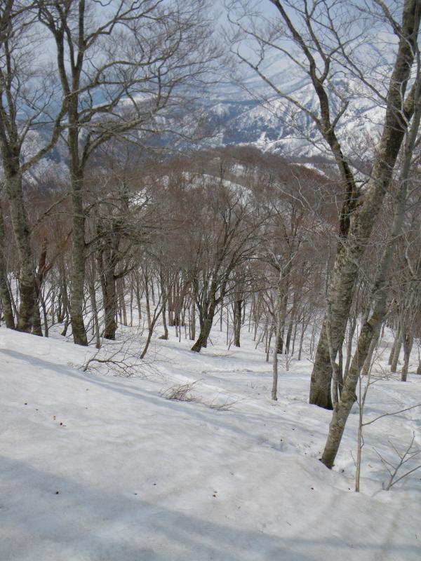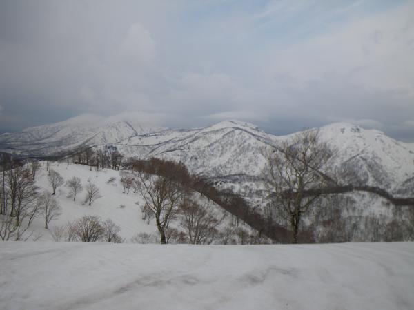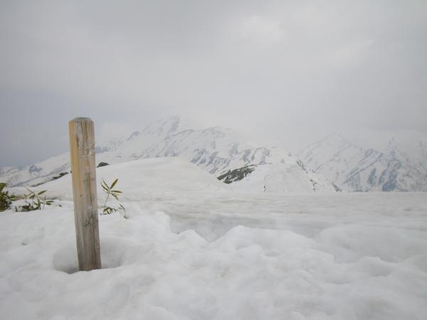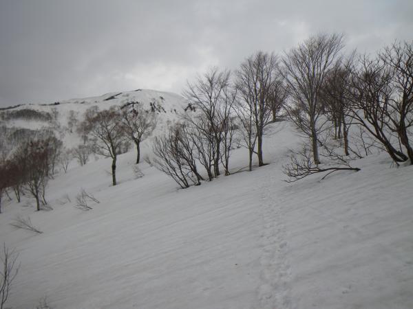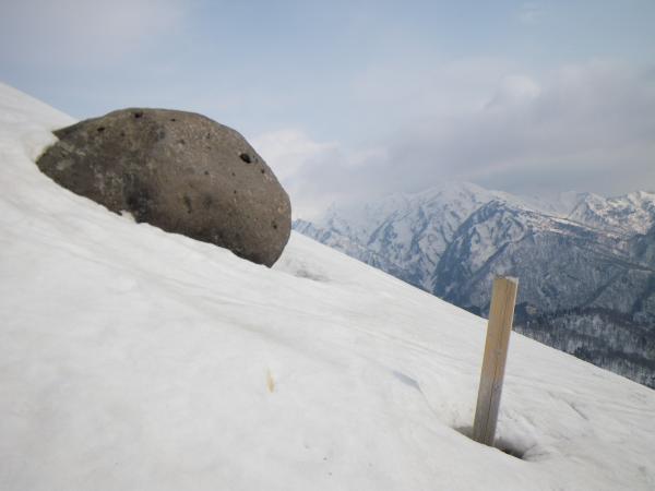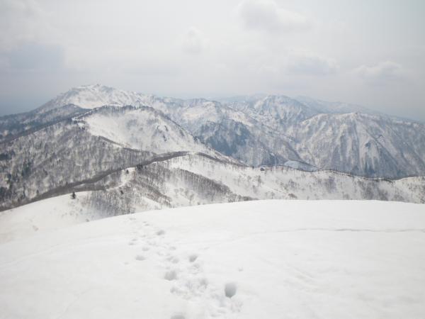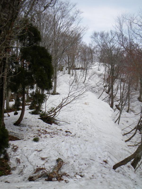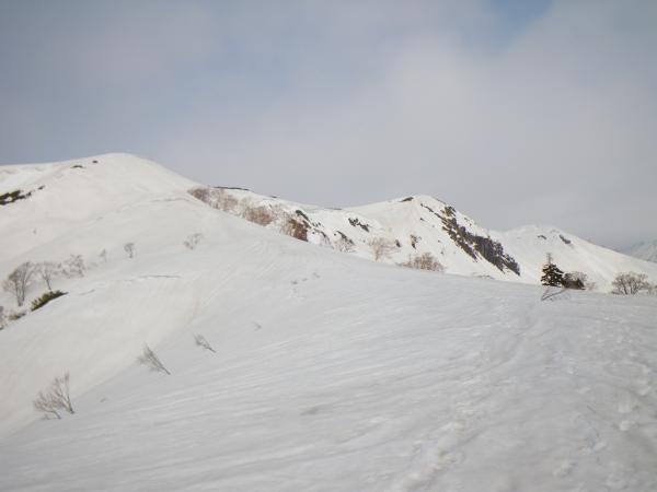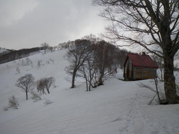 小屋まではなだらかで広い稜線なので、ラッセルが必要な時期はかなり時間のかかる山ではないか。途中の神鳩ノ宮避難小屋を起点として、三ノ峰や願教寺山に出かけるパターンが多い。今回はまだ時間があったので二の峰までは行こうかと計画していたものの、ガスっていて進まなかった。ちなみに銚子ヶ峰から先は遠くない感じだが、雪庇の亀裂が結構、走っていて、時間がかかりそうだった。