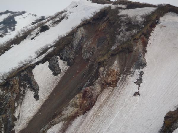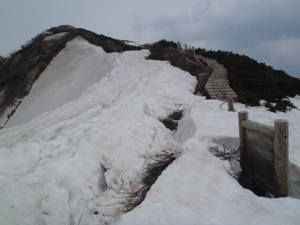 5合目を過ぎると雪が溶けている箇所は少ないですが本来道ではないところに雪が積もっているところがありそこにトレースが付いているところがありますが危ないので決して通らないようにしましょう。8合目すぎの左側にトレースがりますが木道がもう見えてますのでそちらを通って下さい。左側は危険です。