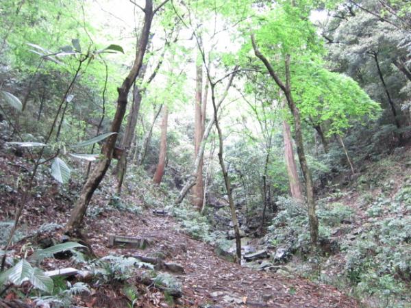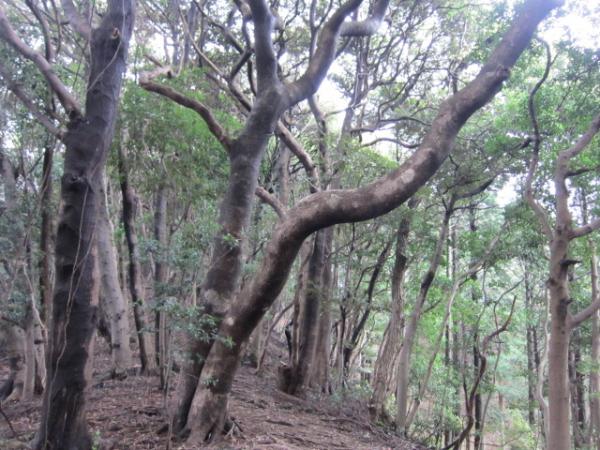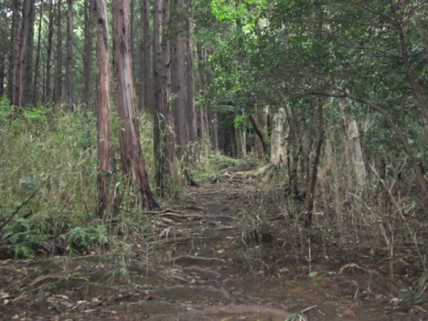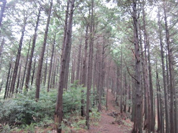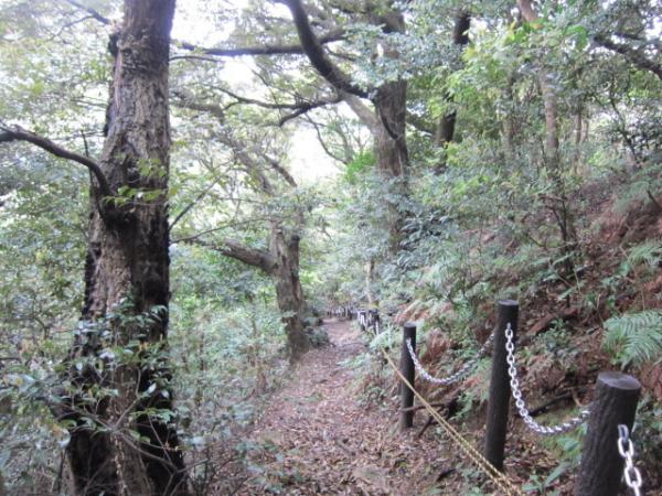 - 神社の境内を過ぎると尾根までは、ジグザグに登っていきます。距離的には短いですが、この区間は、滑りやすく急で、道幅も狭く、歩きづらいです。特に下りでは注意が必要です。ストックの携行やハイカットのライトタイプ以上のシューズがおススメです。