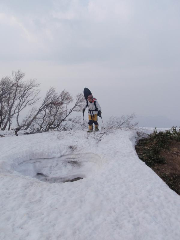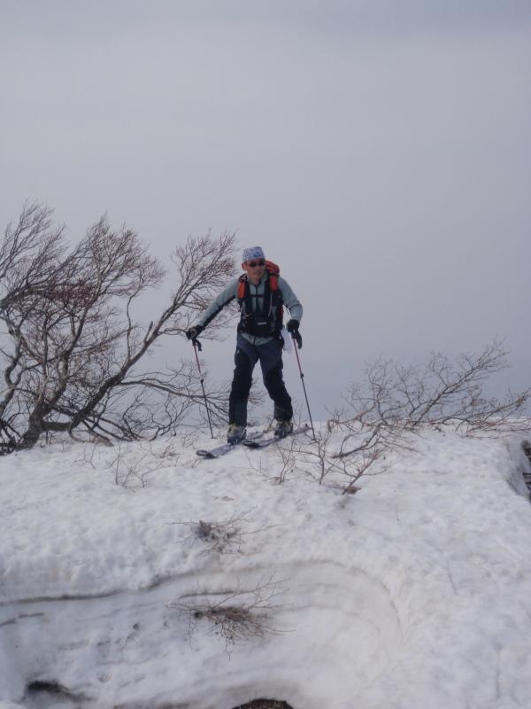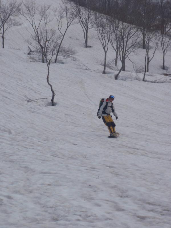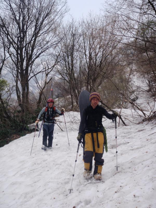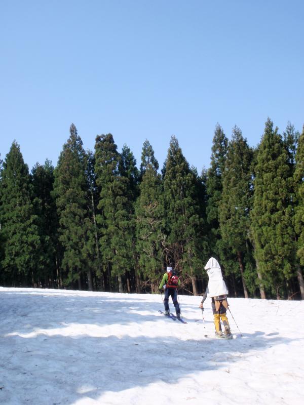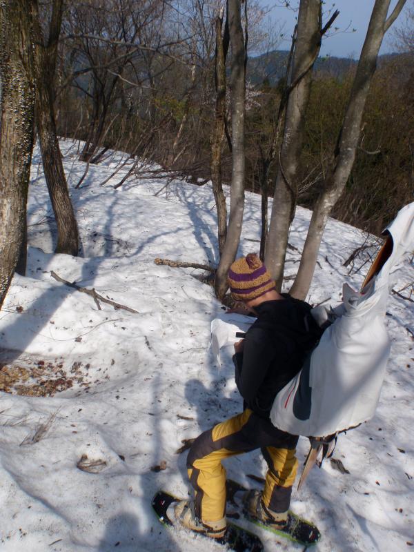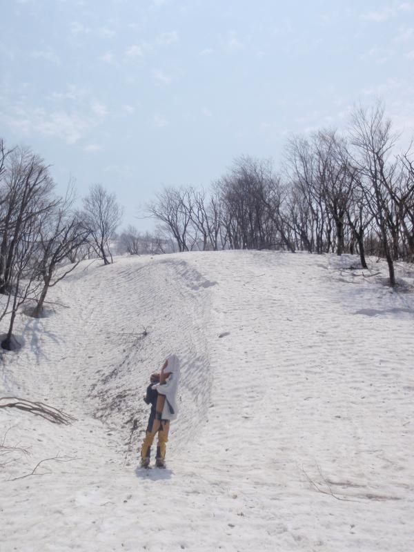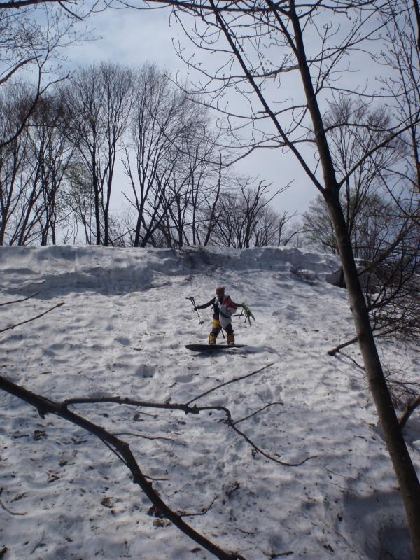 雪も700m以下は腐っていて、急斜面では苦戦しました。800mくらいになると雪も安定してスキーを履くことができました。