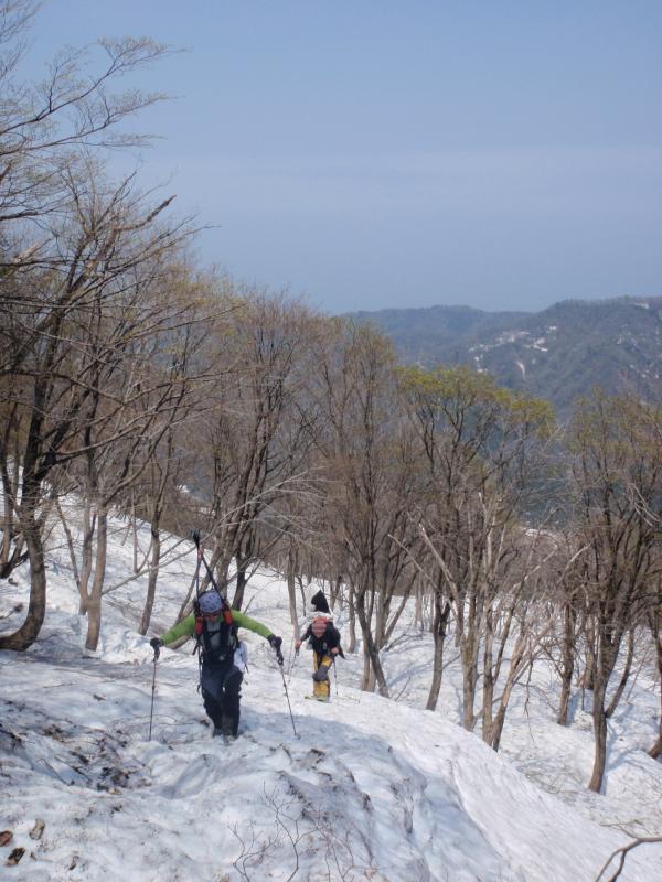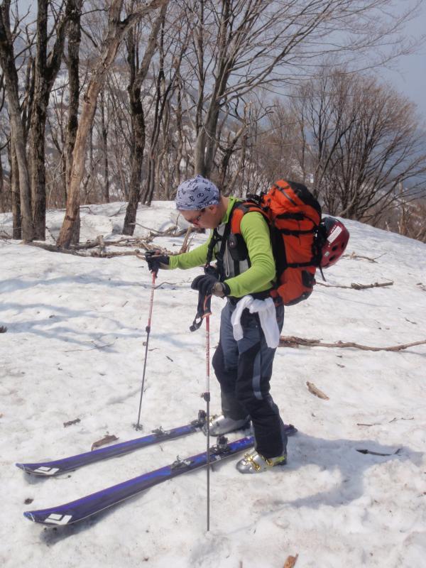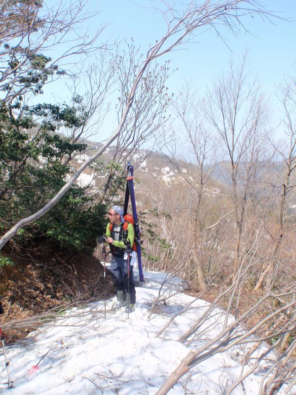 登り始めて600m付近で雪は切れており、スキーを担いで登りました。これがまたしんどかった~。