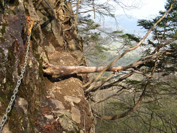 御岳の少し手前から道は険しくなりますが、木々の切れ間から見える景色は素晴らしいです。御岳の先の鎖場は握力に頼る部分が多く、滑り止めの付いた手袋は必携。気を抜かずに進んで行くと、時々見える丁須の頭がどんどん大きくなっていきます。