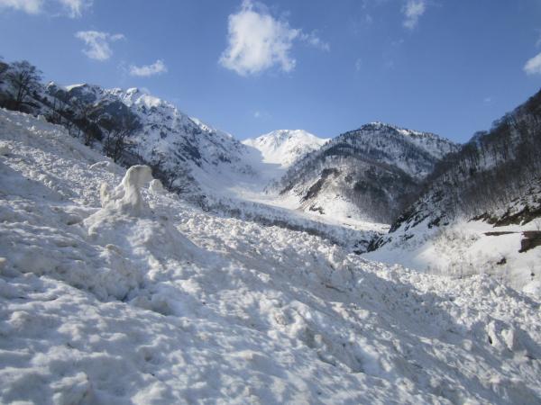 ただ左俣林道では、多くのデブリが道を塞いでいるので、乗り越えていくのに、意外と時間がかかります。スキーを担いで登る方は難儀するかもしれません。