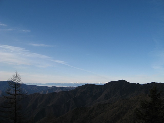 遠くに見えるのは南アルプスの山々。頂上付近はもう雪山?