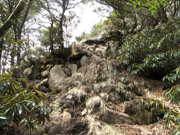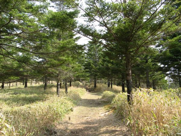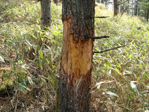 七ッ石尾根はしっかりした登山道の両脇に笹が広がっていて、のんびり歩けるとても気持ちのいい道です。しかし登山道周辺の木には鹿の食害の跡が多数あり、枯れてしまわないか少し心配。