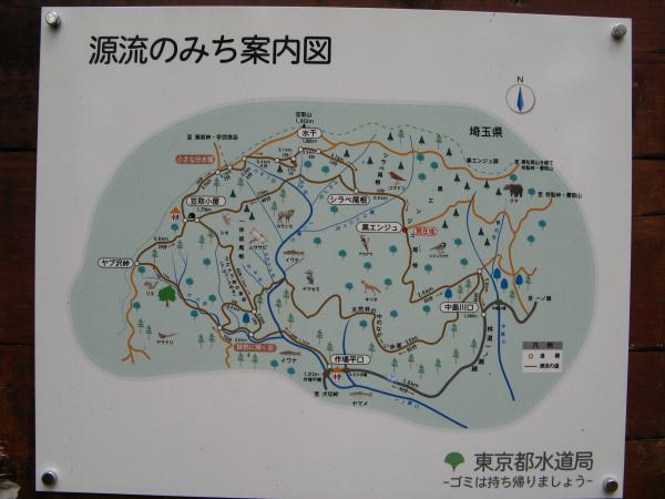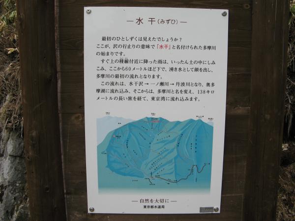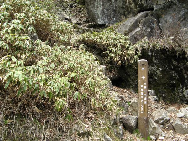 そして目当ての多摩川の出発点。実際に見ると山でよく見かける沢水がチョロチョロ流れ出しているだけの風景ですが、この場所が大きな多摩川の始まりだと思うと少し感慨深いものがありました。