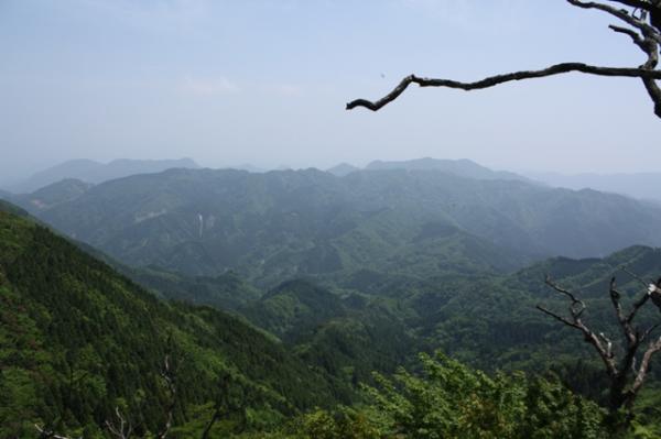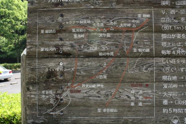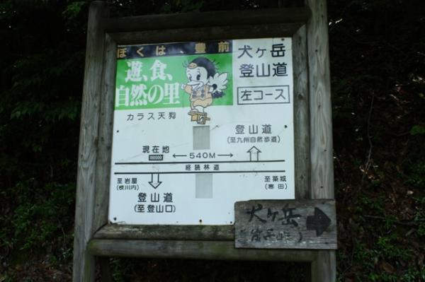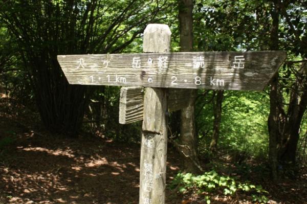 - 登山口-(60分)-林道-(50分)-笈吊峠-(90分)-犬ヶ岳山頂-(15分)-大竿峠-(110分)-登山口
