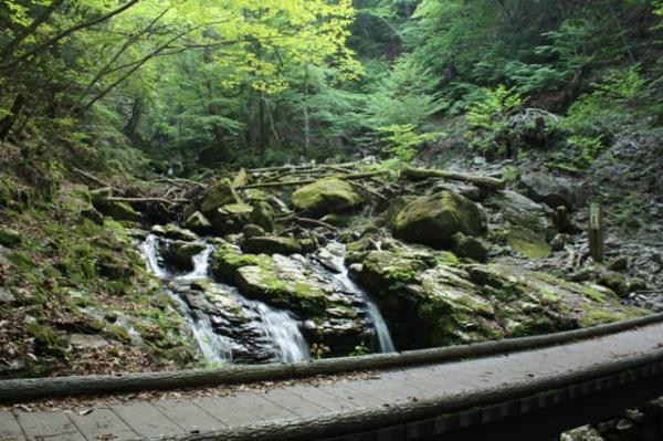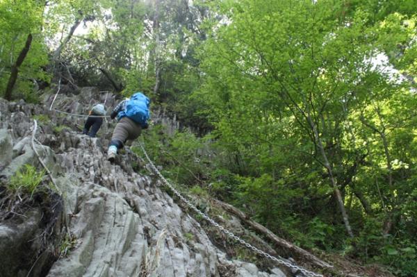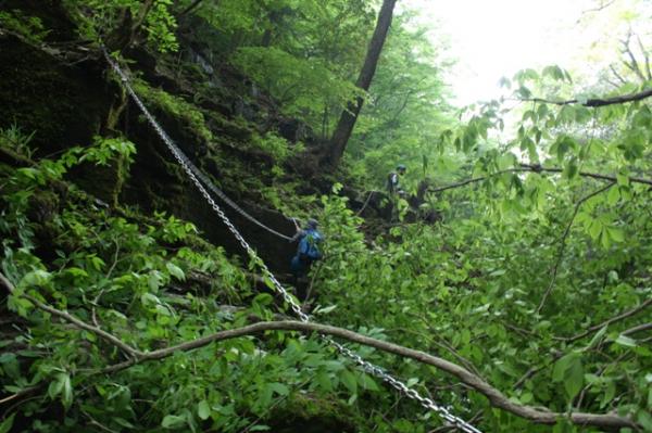 - 歩きやすいですが、全体的に急です。途中20mの岩に鎖がかかっている所があり、バランスを崩すとかなり危険ですので、自信がない方は迷わず迂回路を利用してください。下山に利用した恐淵のルートの川を渡る時に、鎖がありますが、雨など岩が濡れている時は、滑りやすいので特に気を付けて下さい。山頂付近はツクシシャクナゲが沢山自生しており、花や景色を堪能しながらのんびり歩けます。