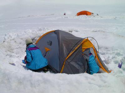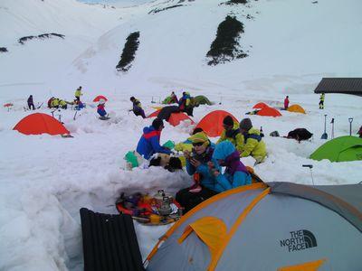 - 初日は晴天で表面がシャーベット状の雪。2日目は大雨。3日目は晴れでガリガリ。スノーシューよりもアイゼンが必要。