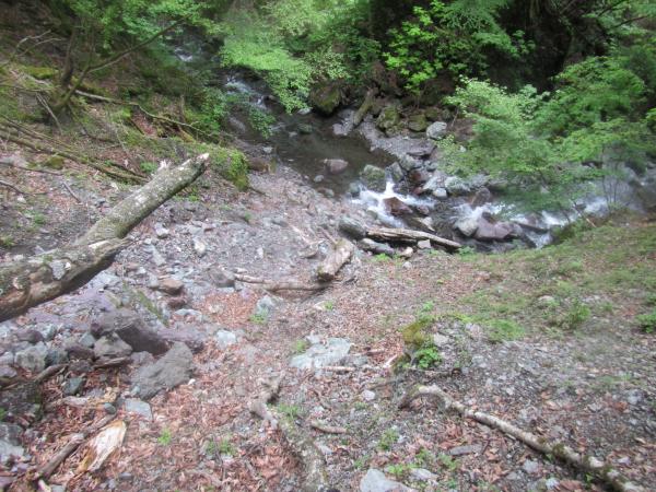 ・少し戻った左岸の小沢から高巻いて、狼谷へ急下降する方が分かりやすいと 思われます。
