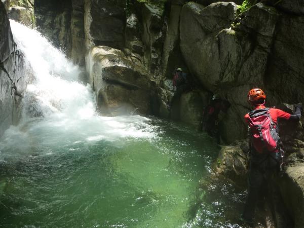 翌日は、肌寒いなか意を決して濡れたウェアを身に纏い、井戸淵と呼ばれるゴルジュを高巻き、低い水温にめげず順調に遡行。