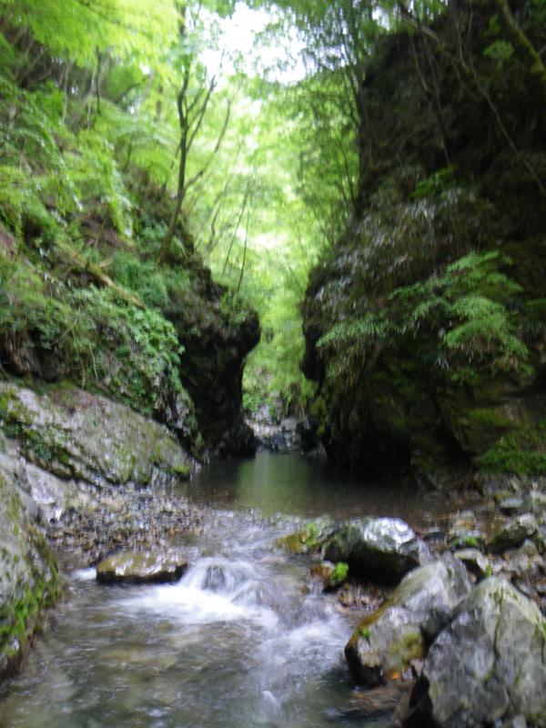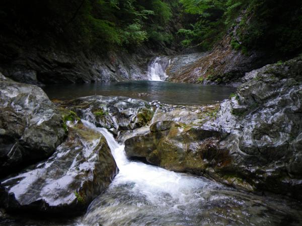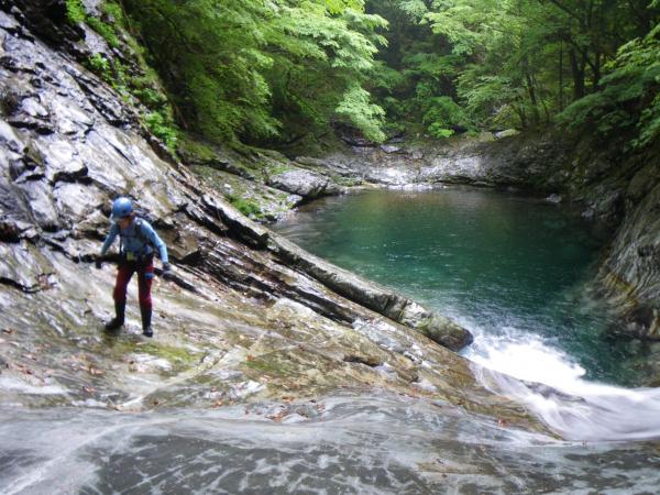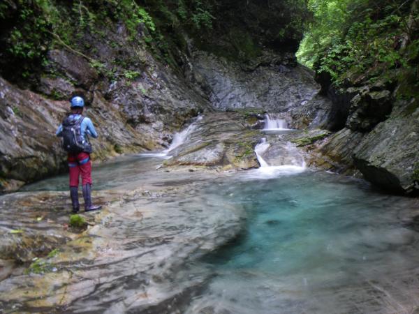 名のある滝がいくらかあり、巻きもしっかりしていて、迷うこともない。2箇所ほど、テープで引き上げたり、ザイルを出したくなる箇所があるが、1ポイントのみで、難しくはない。河原歩きも多く、その為に初級なのだろう。つめでもやぶもなく、快適。