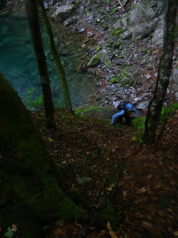 ⑥ジョレンの滝は左岸を高巻き、小尾根っぽい所を登っていく。トレースに従い、滝上へ下降