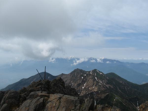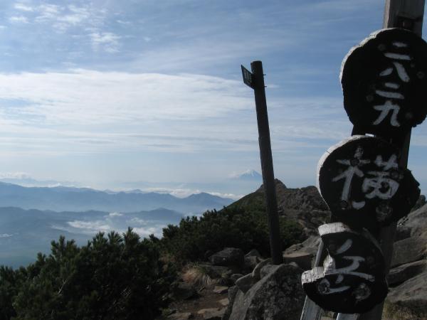 硫黄岳までの樹林帯は雪が多く、歩きにくかったですが、稜線に上がると程よい日差しと微風でとても快適でした。さらには南ア・中ア・北ア・富士山が全て見える大展望!!