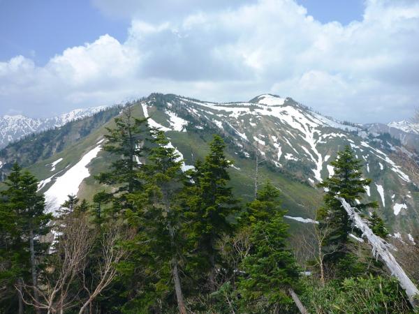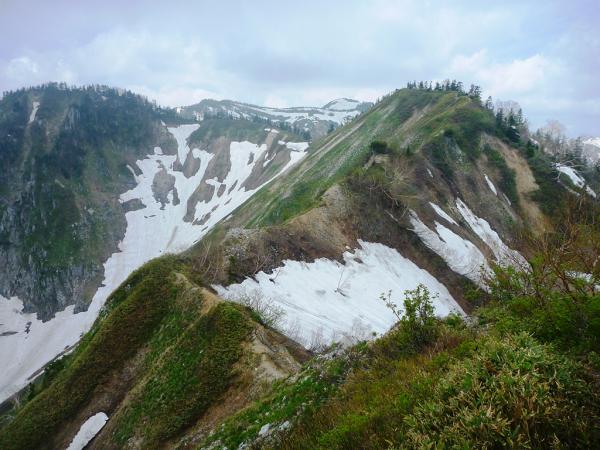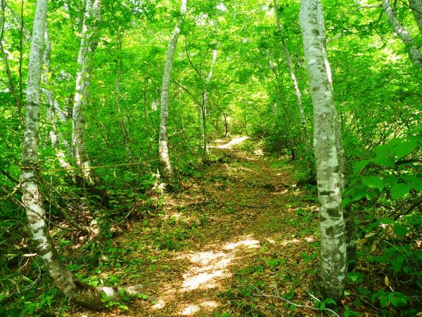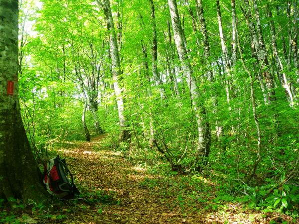 登山口からしばらくは急な登りで、ブナ林の新緑の中を歩きます。1時間ほど歩き、南東からの尾根と合流すると少しなだらかになりますが、それも少しの間。4等三角点を過ぎると再び急登が始まります。