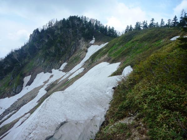 山頂が目線の高さと同じになるころ、ガレ場が現れます。左右共に切れ落ちているので慎重に。