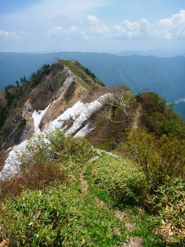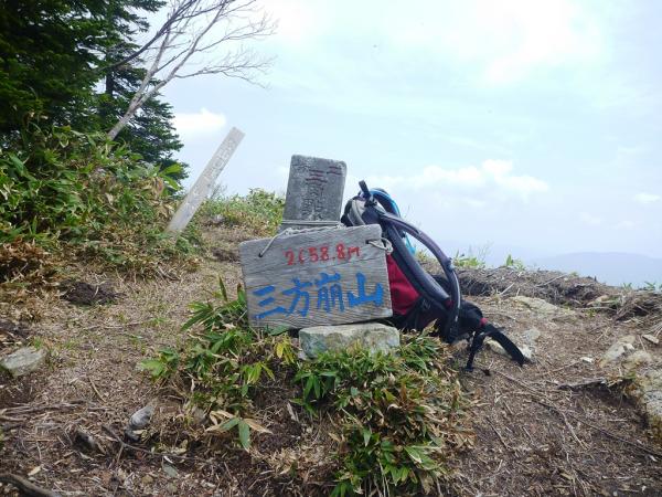 尾根を真っ直ぐ200m程登ると展望が開け、急登は終わり。三方崩山山頂が視界に飛び込んできます。