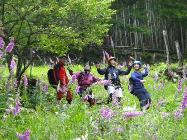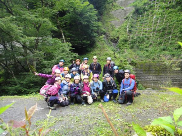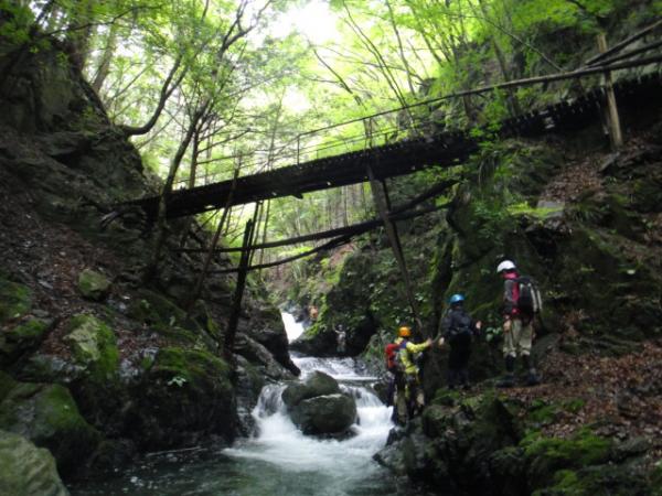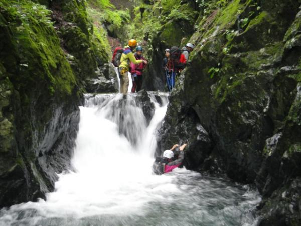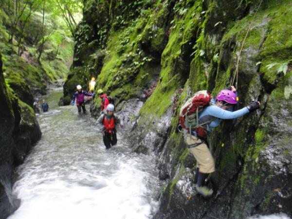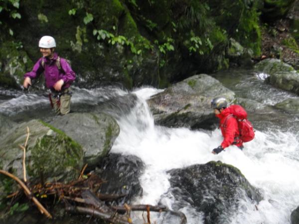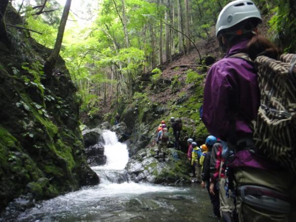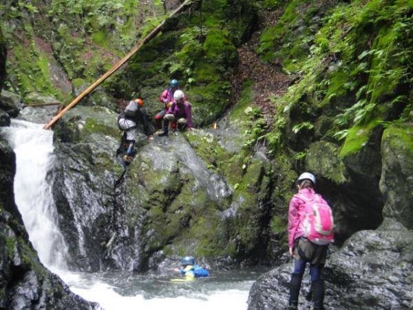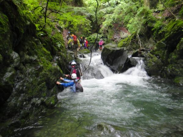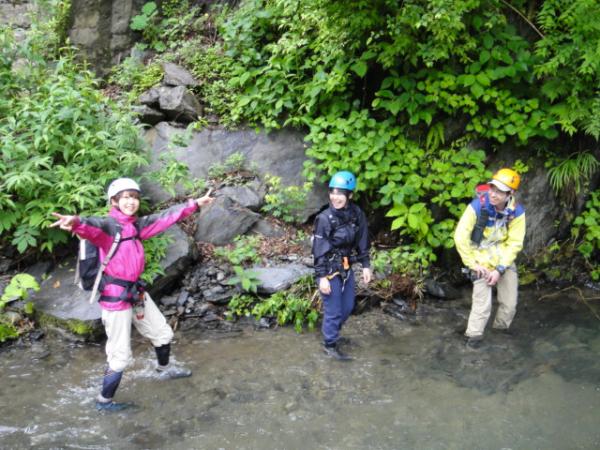 宇都宮の小澤店長、銀座の小澤副店長、横須賀の山本さんを各班のリーダーとし、時間をずらして出発です。私は山本班。最後の班の一番後ろ。つまりはドンケツってヤツです。水が冷たいせいで一同レインウェアを着用していたため、暗ったい沢の中で色味が映えていました。銀座・小澤班に入っていた、調布の家田店長がわらじスタイルなのが印象的でした。