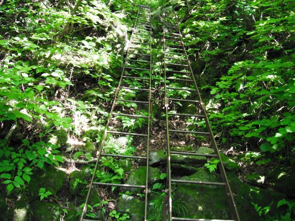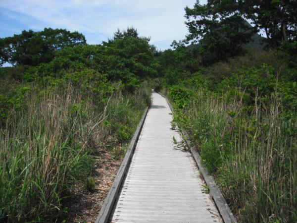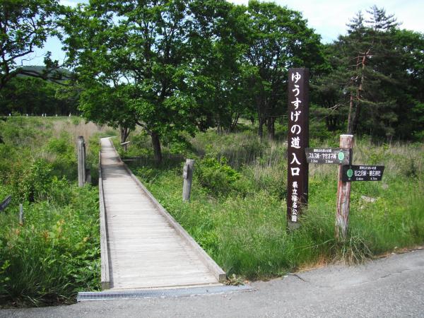 車で5分程移動したところに相馬山があります。ゆうすげの道は、木道になっており、季節の花々が時期によって咲くそうです。ちなみにこの時期は何もありませんでした。木道を歩くと、登山口に着きます。途中鎖場やハシゴがあるので注意してください。コケが岩に張り付いていて、滑る箇所もあります。