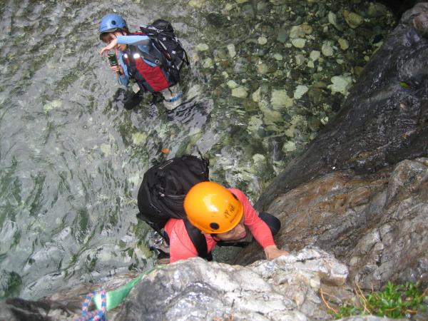 ②入渓からすぐに、深い釜が出てきて、右岸なら岩場を上がる、左岸なら岩場のトラバースという箇所が出てくる。私たちは右岸を選択、ここは腰くらいの釜から岩場に取り付く。お助けロープ使用。