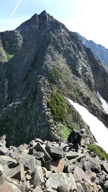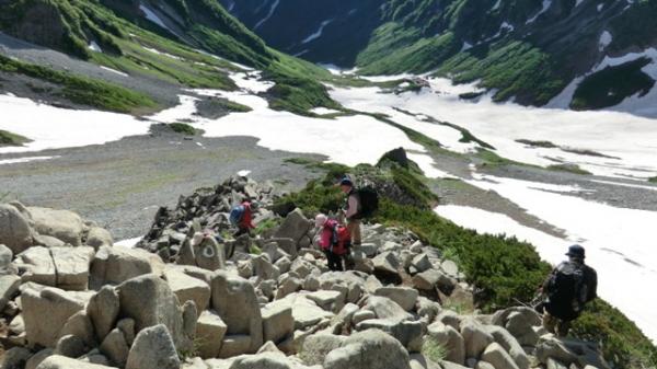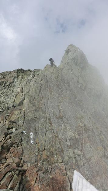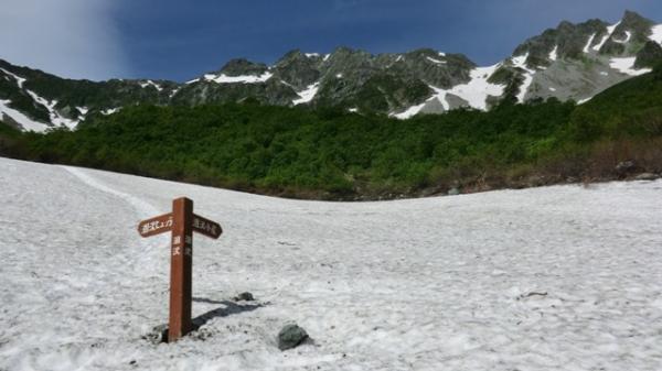 - 西穂高岳~奥穂高岳までは稜線沿いで岩とガレ場 方向指示の為に白丸が書いてありますが、分かりづらいところもあります 天狗沢 白出沢方面は雪が結構残っているのでアイゼンが必要とのことでした (白出沢は増水すると通行止めになるようです) 涸沢近辺も雪が結構残っていました