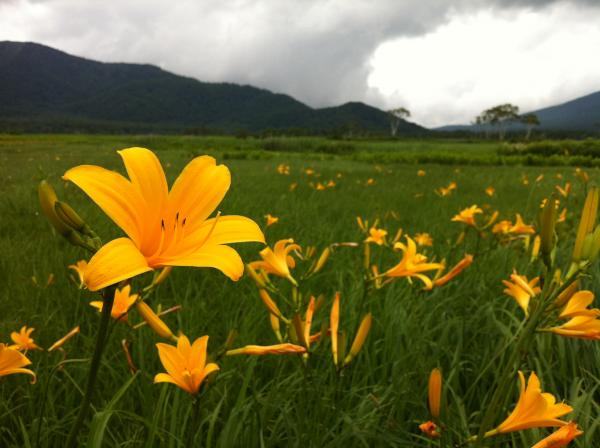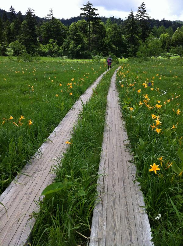 尾瀬ヶ原から尾瀬沼へ続く木道からは、ニッコウキスゲ、ヒツジグサ、ワタスゲ、ヒオウギアヤメなどの湿原植物を見ることができましたが、鹿などの動物が花が咲く前に食べてしまい、今年は例年い比べ少ないそうです。
