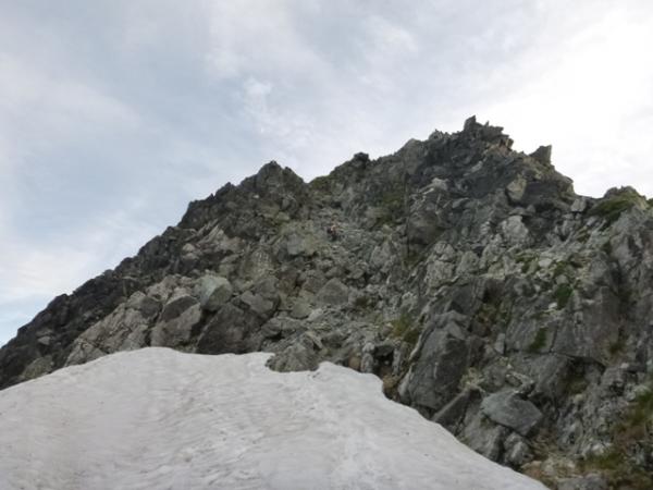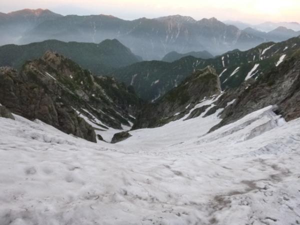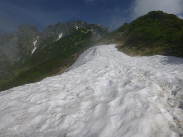 この時点では稜線まで雪渓が残っており、クレバスも少なく、