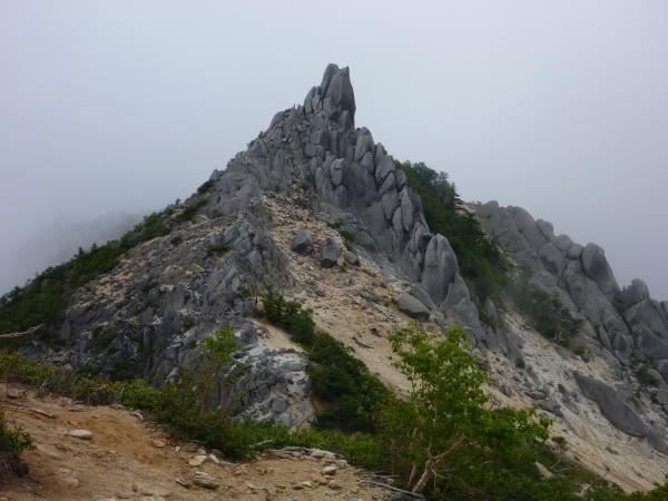 地蔵ヶ岳の最後のピナクル部分は、残置ロープが付いていますが、一般登山者のクライミングは止めた方が賢明と思えます。肩の部分までも慎重な行動で登れますが、クライムダウンを余儀なくなる為に、自信の有る所までで、引き返して下さい。