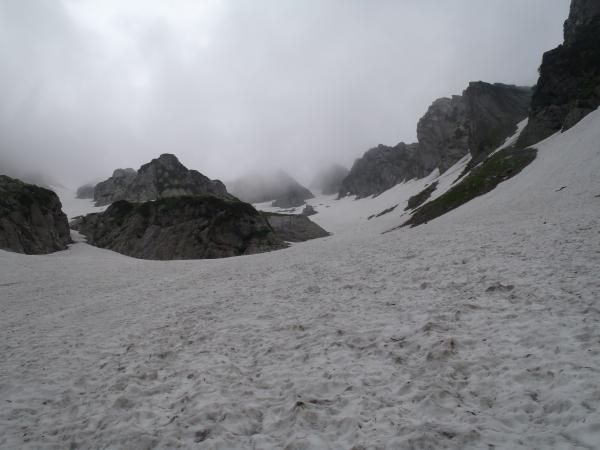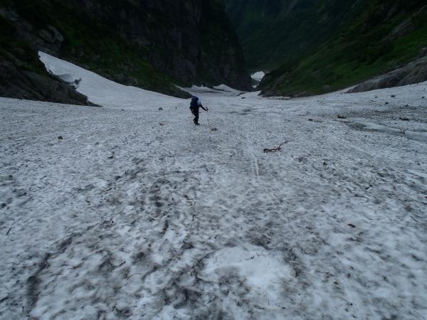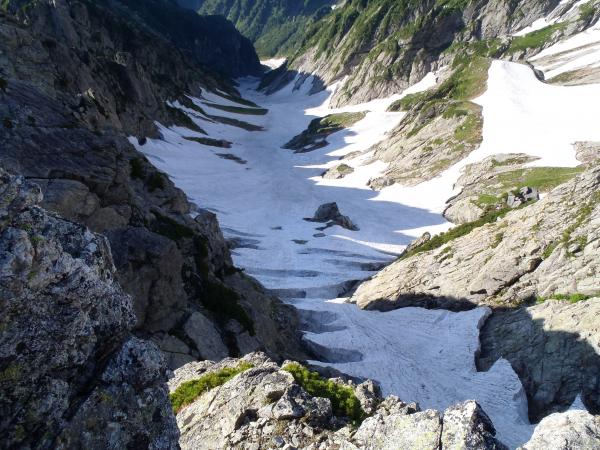 長次郎谷、右俣、左俣、シュルンド、落石注意。