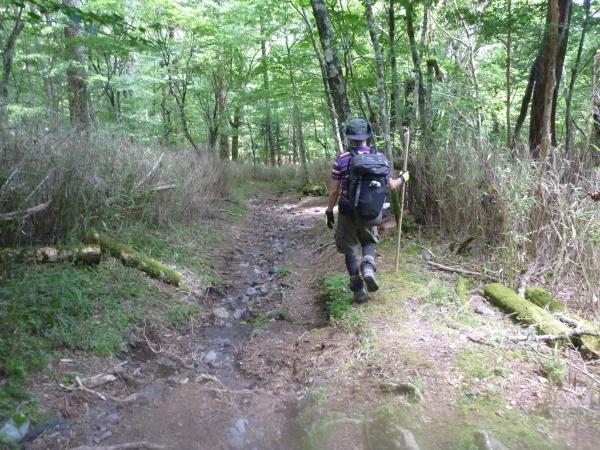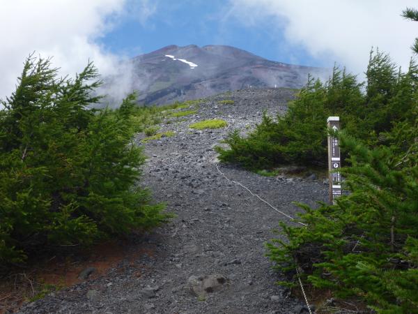 上り一合(水ヶ塚入口)-(35分)-一合五勺-(60分)-二合五勺(御殿庭下、ガラン沢分岐)-(30分)-三合目(御殿庭中)-(30分)-新五合目分岐-(30分)-富士宮口新五合目-(15分)-六合目(雲海荘、宝永山荘)-(60分)-新七合目(御来光山荘)